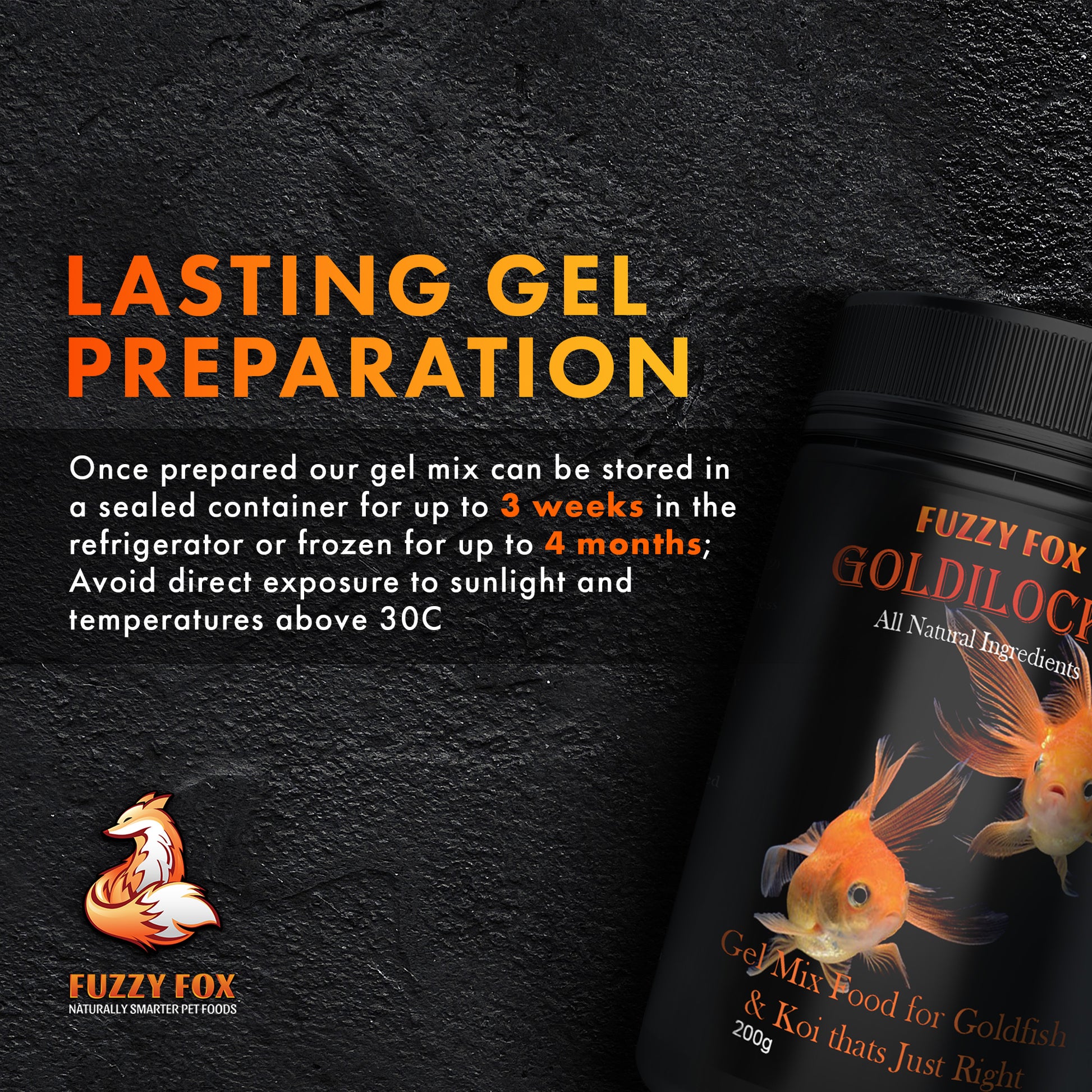 Goldfish and Koi Gel-mix, the latest innovation from Fuzzy Fox, designed to revolutionize the way you feed your goldfish and koi. This premium gel food mix offers a scientifically formulated, nutritionally complete diet tailored to meet the specific needs of both goldfish and koi, ensuring they thrive. With Goldilocks you can provide your fish with the perfect balance of nutrients, promoting vibrant colors, optimal growth, and overall health.
