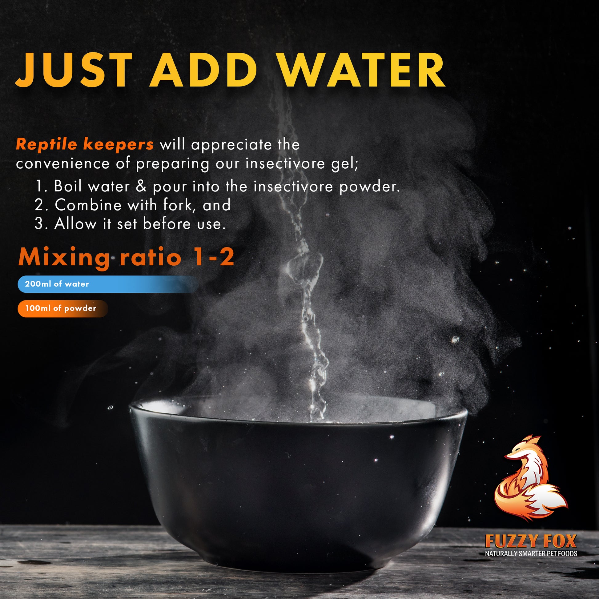 Take a measuring cup and pour in the desired quantity of powder, pour the powder in a mixing container. Add 2x boiling water into the measuring cup and pour the boiling water into the mixing container. Stir the powder and water with a fork until completely mixed. Place in the fridge to let the gel set, times will vary based on quantities made and mix is ready once firm.